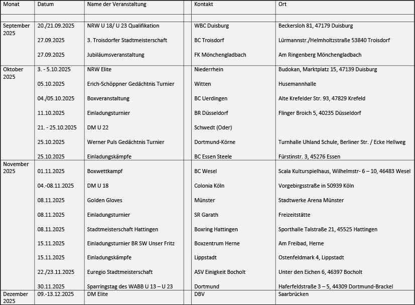 Terminübersicht 2025 Boxen, Stand 19.09.2025