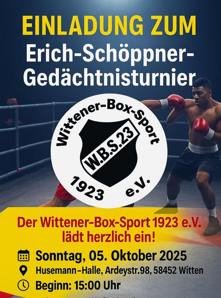 Der Wittener-Box-Sport 1923 e.V. lädt herzlich ein!Sonntag, 05. Oktober 2025Husemann -HalleArdeystr.9858452 WittenBeginn: 15:00 Uhr